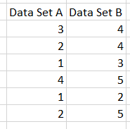Data for Pearson's Correlation Coefficient must come from Excel (not SQL source). Below is an example of two datasets ready for analysis.